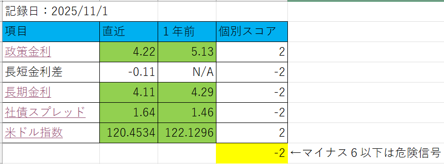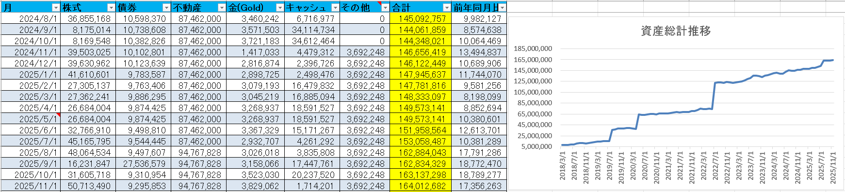 ホーム > 投資 > 2025年10月の資産運用結果報告(通算93ヶ月目) 2025/11/02 2025年10月の資産運用結果を報告します。 ※掲載データは2025年11月1日に集計したものです 総資産 後述するように現金を250万円ほど管理外となったにもかかわらず高値更新するほど株が上がって儲かった。 総資産 投資環境スコア 問題なし。 投資環境スコア トピック 母親の現金の管理を姉に預けた これまで介護のために私が預かっていた母親の現金を姉に預けた。こんのため250万円ほどキャッシュが減少した。 - 投資, 資産運用結果報告
